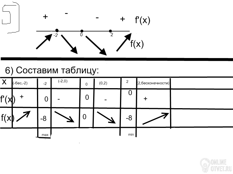 5) Отметим критические точки на числовой прямой и определим знак производной на каждом интервале: