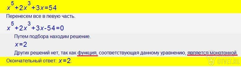помогите пожалуйста) используя свойство монотонности функций, решите уравнение x^5 + 2x^3 + 3x = 54 решение лучше на листике, пожалуйста))