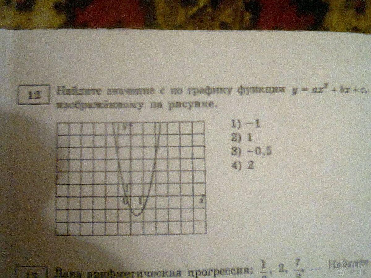 функция имеет вид у= ах²+вх+с при х=0 у=с,значит это точка пересечения графика с осью ОУ значит в нашем случае с=-1