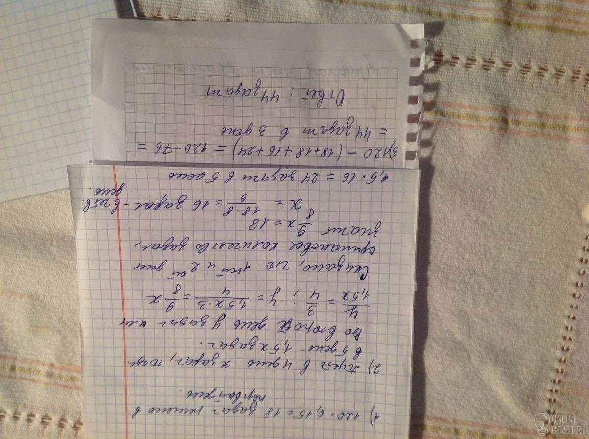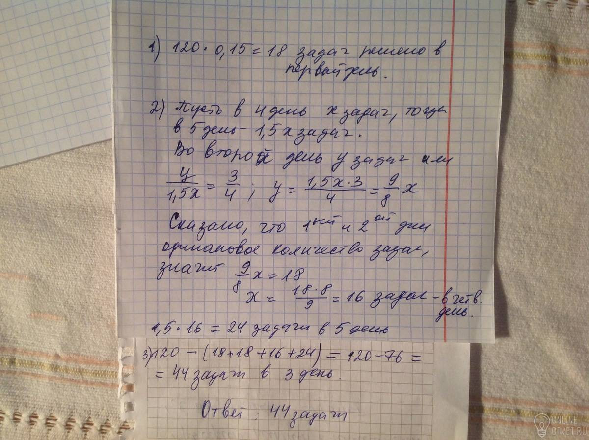 Для подготовки к экзамену Петя прорешал за 5 дней 120 задач по математике. За первый день он решил 15% от всех задач, в четвертый день- в полтора раза меньше задач, чем в пятый. Количество задач, решённых во второй день относится к количеству задач, решённых в последний день, как 3:4. Сколько задач решил Петя в третий день, если в первый и второй дни он решил одинаковое число задач?