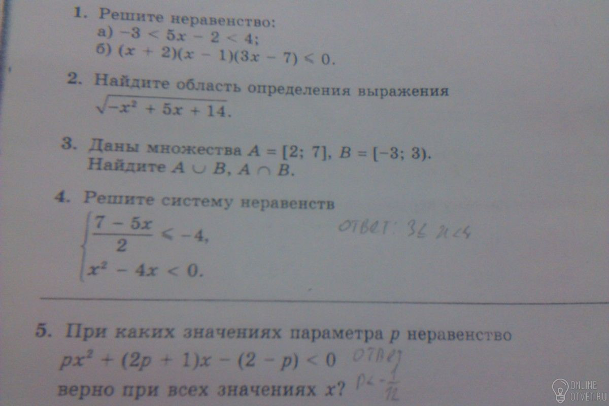 ну там 1 задание (б) получается (х+2)(х-1)(3х-7)меньше или равно нулю каждую скобку приравниваем к нулю получаем х+2=0 х=-2 ; х-1=0 х=1; 3х-7=0 3х=7 х=7/3(дробь) х=2 1/3 изображаем прямую на ней эти три точки изображаем интервалы штрихуем минус ответ будет (-бесконечность;-2);(1;2 1/3) где -2 ,1 и 2 1/3 скобки квадратные