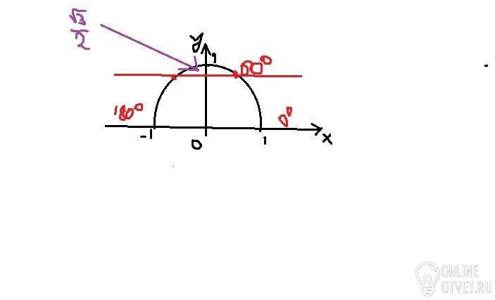 Рисуем единичную полуокружность, т.е. ее радиус равен единице. Расстояние от точки пересечения осей до окружности равно 1. Градусная мера полуокружности - 180°. Нас интересует угол 60°. 180:60=3, т.е. наш угол составляет третью часть полуокружности. Делим нашу дугу на три равные части (красные точки). Проводим прямую через первую точку параллельно оси ОХ (горизонтально). Почему? Да потому что синус - это у, косинус - это х. Нам нужен синус. Следовательно, мы должны провести прямую так, чтобы она пересекала ось ОУ. И она пересекает ее в точке .