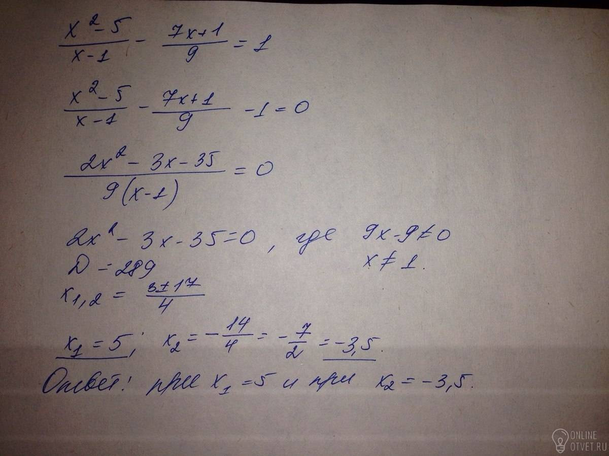 Существуют ли такие значения переменных ,при которых разность дробей х^2 -5/х-1 и 7х +1/9 =1?