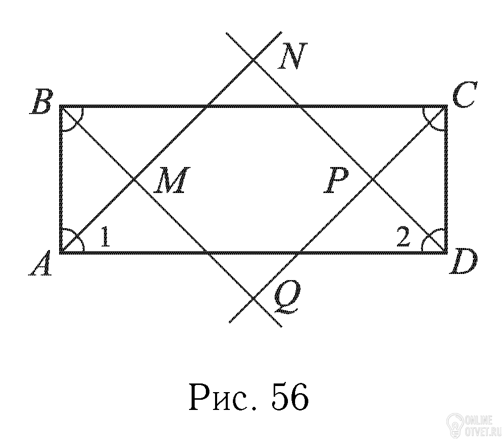 Решение. Пусть MNPQ — четырехугольник, образованный при пересечении биссектрис углов прямоугольника ABCD (рис. 56).