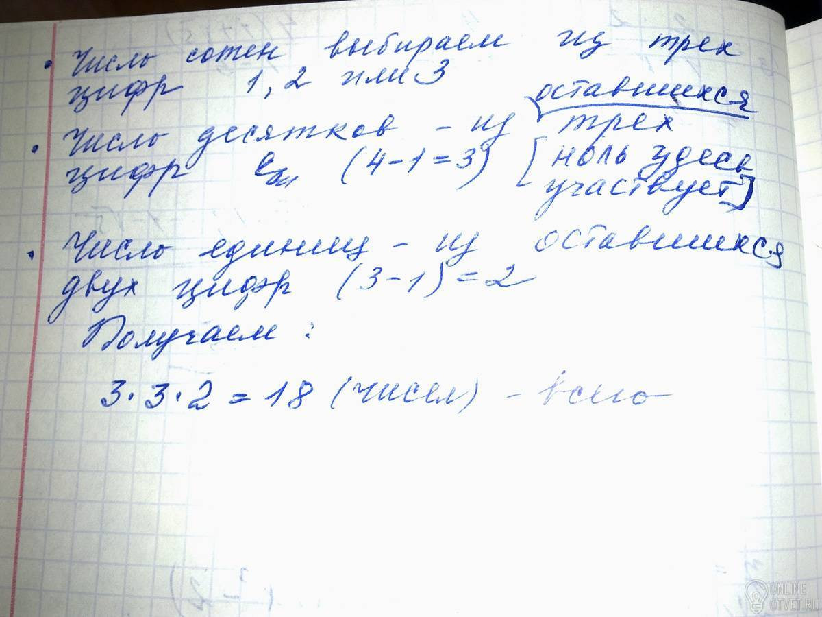 Сколько трехзначных чисел можно составить из цифр 1,2,3,0 при условии, что каждая цифра может содержаться в записи числа лишь один раз?