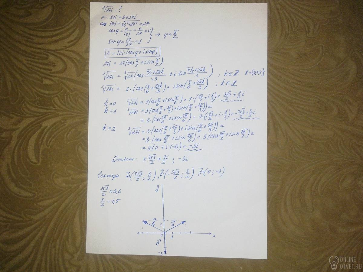 Найти все различные значения корня n-ой степени, построить векторы, соответствующие этим значениям. Ответ записать в алгебраической форме.