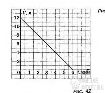 Из бака емкостью 12 л, наполненного доверху водой, равномерно вытекает вода. График зависимости V от t, где V — объем воды в баке (в литрах), at — время вытекания воды (в минутах), построен на рисунке 42.