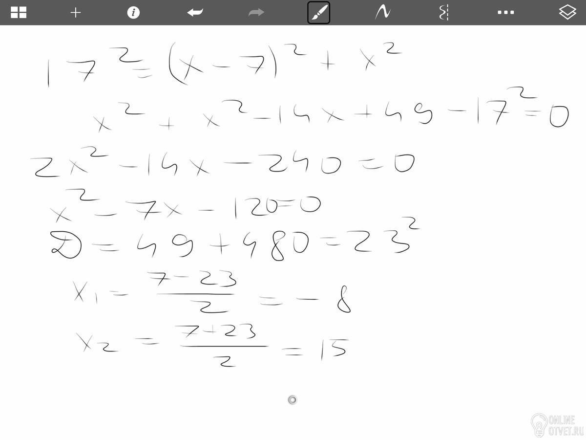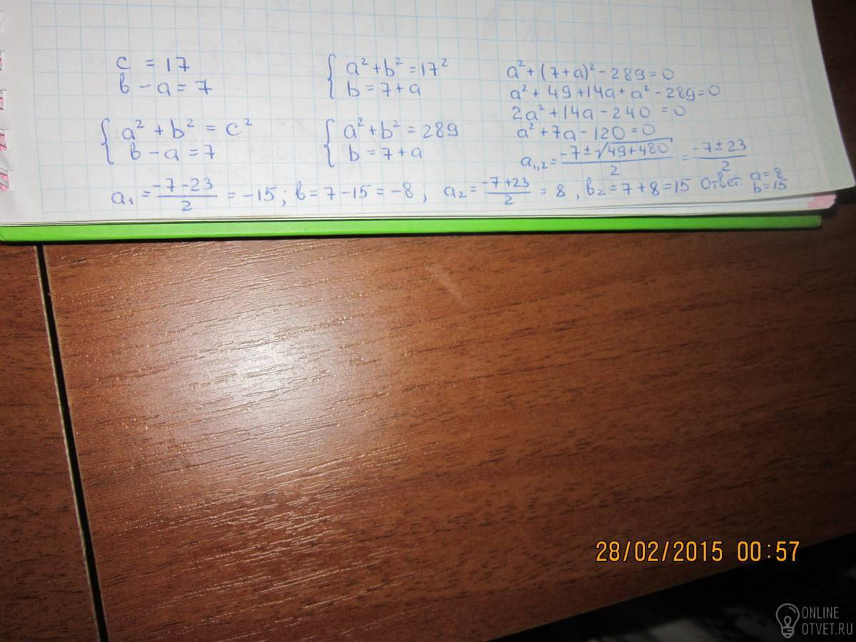 Гипотенуза прямоугольного треугольника равна 17 см,а разность длин катетов равна 7 см. Найдите длину каждого катета данного треугольника. Решить с помощью квадратного уравнения.