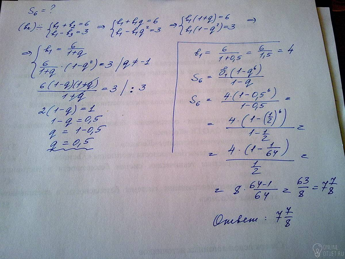 Помогите пжл!в геометрической прогрессии сумма первого и второго членов равна 6 а разность между первым и третьим членами ранва 3 найти сумму первых шести членов прогрессии