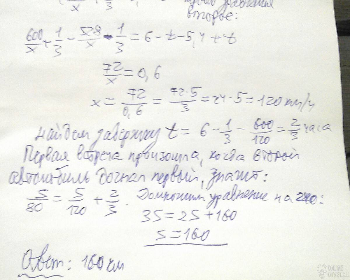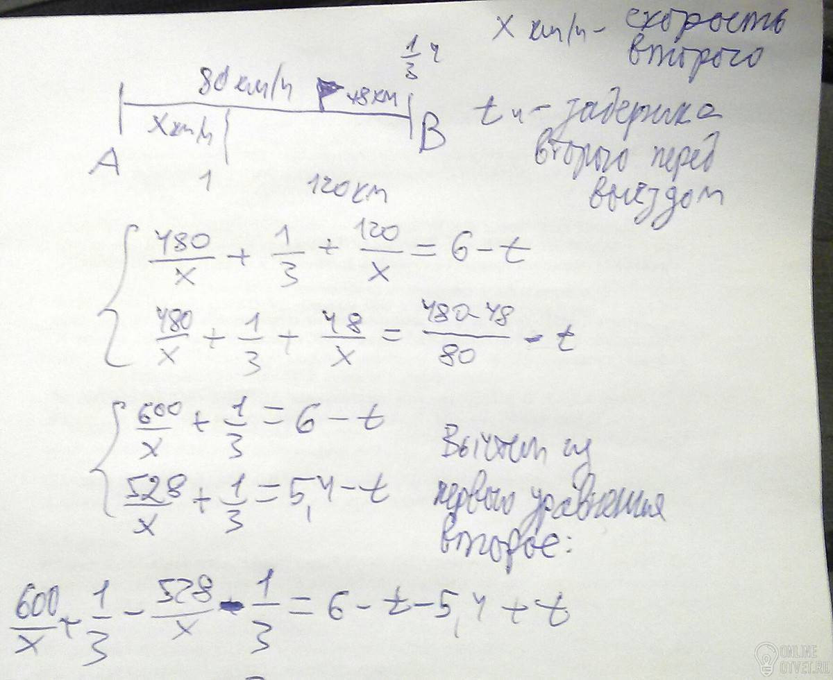 Из пункта А в В со скоростью 80 км/ч выехал автомобиль, а через некоторое время с постоянной скоростью выехал второй . После остановки на 20 мин в пункте В второй автомобиль поехал с той же скоростью назад, через 48 км встретил первый автомобль, шедший навстречу, и был на расстоянии 120 км от В в момент прибытия в В первого автомобиля. Найти расстояние от А до места первой встречи автомобилей, если АВ=480км.