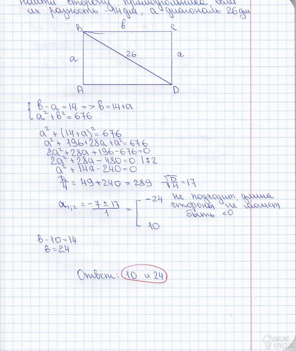 Найдите стороны прямоугольника, если их разность равна 14 дм, а диагональ прямоугольника 26 дм.