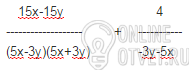 Нужно вынести из знаменателя второй дроби минус чтобы получилось так (5х+3у),потом домножить знаменатель на (5х-3у),чтобы получился одинаковый знаменатель получится (15x-15y)/((5+3y)(5-3y))-(4(5-3y))/((5+3y)(5-3y)),потом сложить дроби