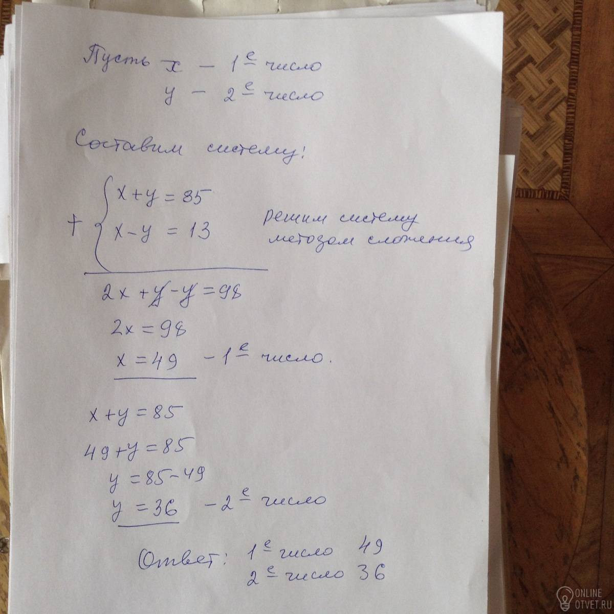 Ученик задумал 2 числа, причем известно, что сумма этих чисел равна 85, а разность 13. Какие числа задумал ученик?