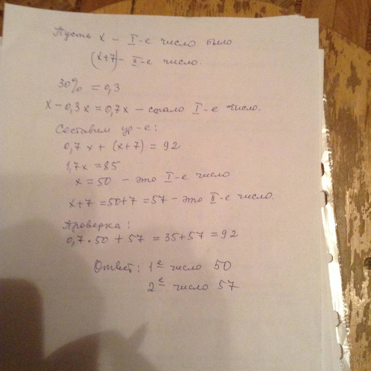 Одно из чисел на 7 больше другого. После того, как меньшее число уменьшили на 30%, их сумма стала 92. найдите эти числа.