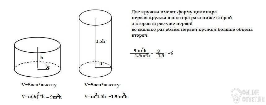 Две кружки имеют форму цилиндра первая кружка в полтора раза ниже второй а вторая втрое уже первой во сколько раз объем первой кружки больше объема второй