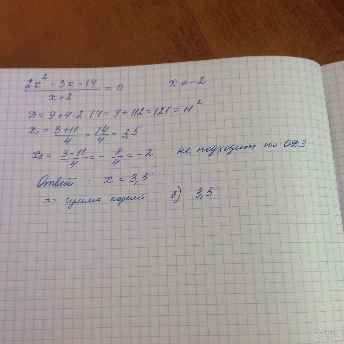 НАЙДИТЕ СУММУ КОРНЕЙ УРАВНЕНИЯ 2Х2-3Х-14:Х+2=0