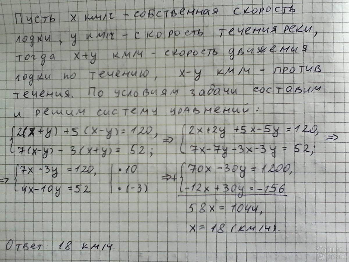 лодка за 2 часа движения по течению и 5 ч против течения прошел 120км, за 7 ч против течения он прошел на 52 км больше, чем за 3 часа движения по течению. найти собственную скорость лодки