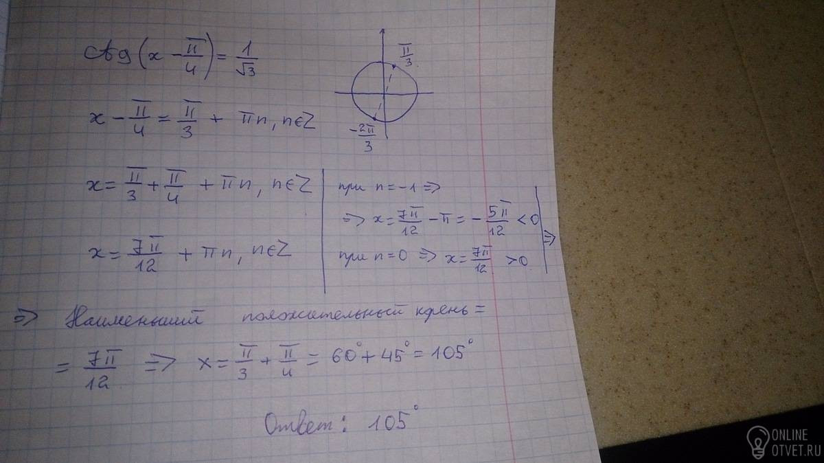Решите уравнение ctg(x-П/4)=1/sqrt3 в ответ запишите величину наименьшего положительного корня уравнения выраженную в градусах. с решением