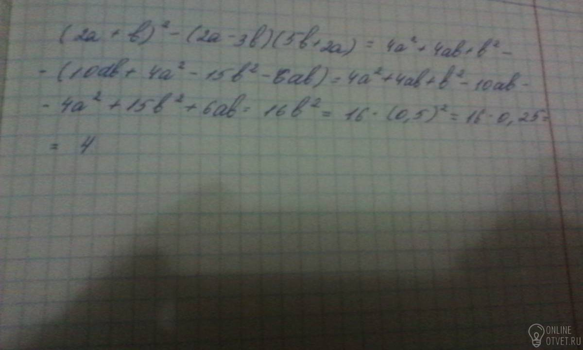 Упростите выражение (2а+в)²-(2а-3в)(5в+2а) и найдите его значение при а=2 и в1/5