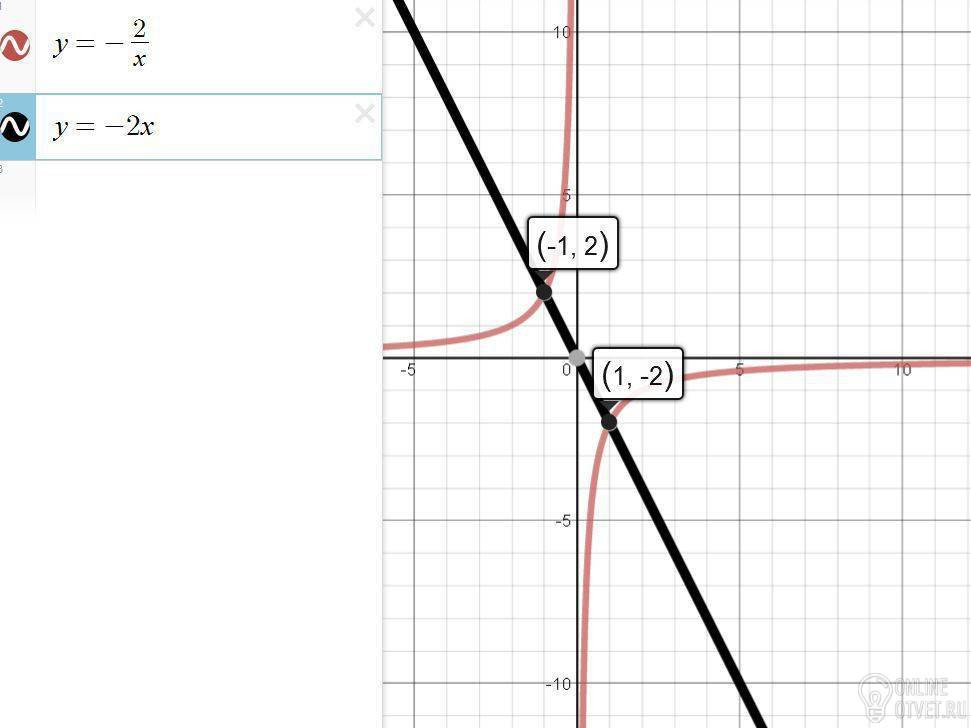 Постройте график функциий y=-2:x и y=-2x укажите координаты точек пересечения этих графиков. если можно то сфоткайте прошу