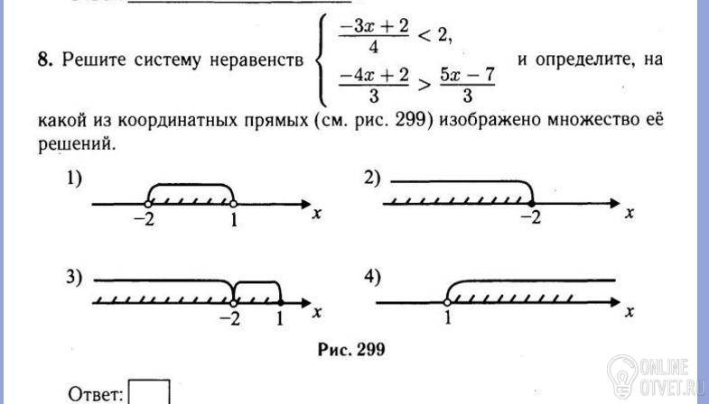 Пишу с планшета поэтому не очень красиво будет смотреться. В системе первое уравнение перепишет в виде -3х+2<2*4; -3х<8-2; -3х<6; х5х-7, так как знаменатели дробей одинаковые. -4х-5х>-7-2; -9х>-9; х<1. Следовательно решением системы уравнений будет множество х∈(-∞;2)∪(2;1). Ответ: 3)