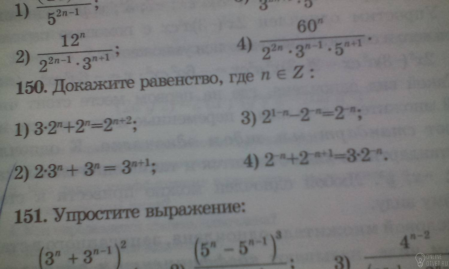 1. 2 в степені ен як спільний множник винести за дужки а вдужках буде (3+1)=4*2 в степені ен. = це ліва частина а в правій скористатись правилом що при множені показники додаються і навпаки, тому теж буде 4*2 в степеніен.