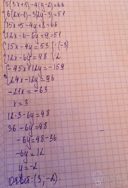Решить смстему уравнений способом сложения 5(3x+1)-4(y-2)=66 6(2x-1)-3(2y-3)=51