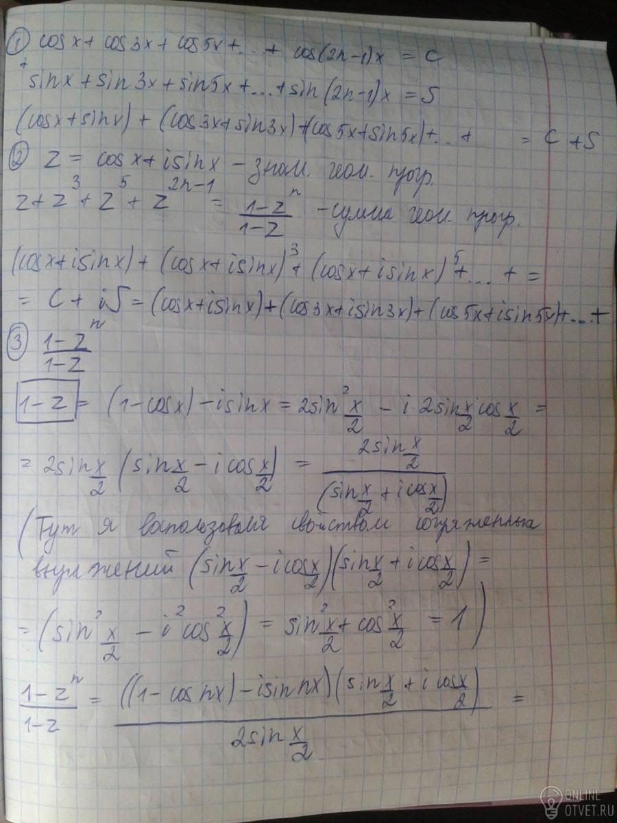 Sinx + sin3x + sin5x + .. + sin (2n-1)x (найти сумму), как такое решать? складывал последнее и первое - не дало ничего. Это в параграфе про комплексные числа, так что возможно нужна формула муавра. Задача под всеми возможными звёздочками, поэтому прошу, если решили, то очень и очень доходчиво объясните. Удачи с ребусом.