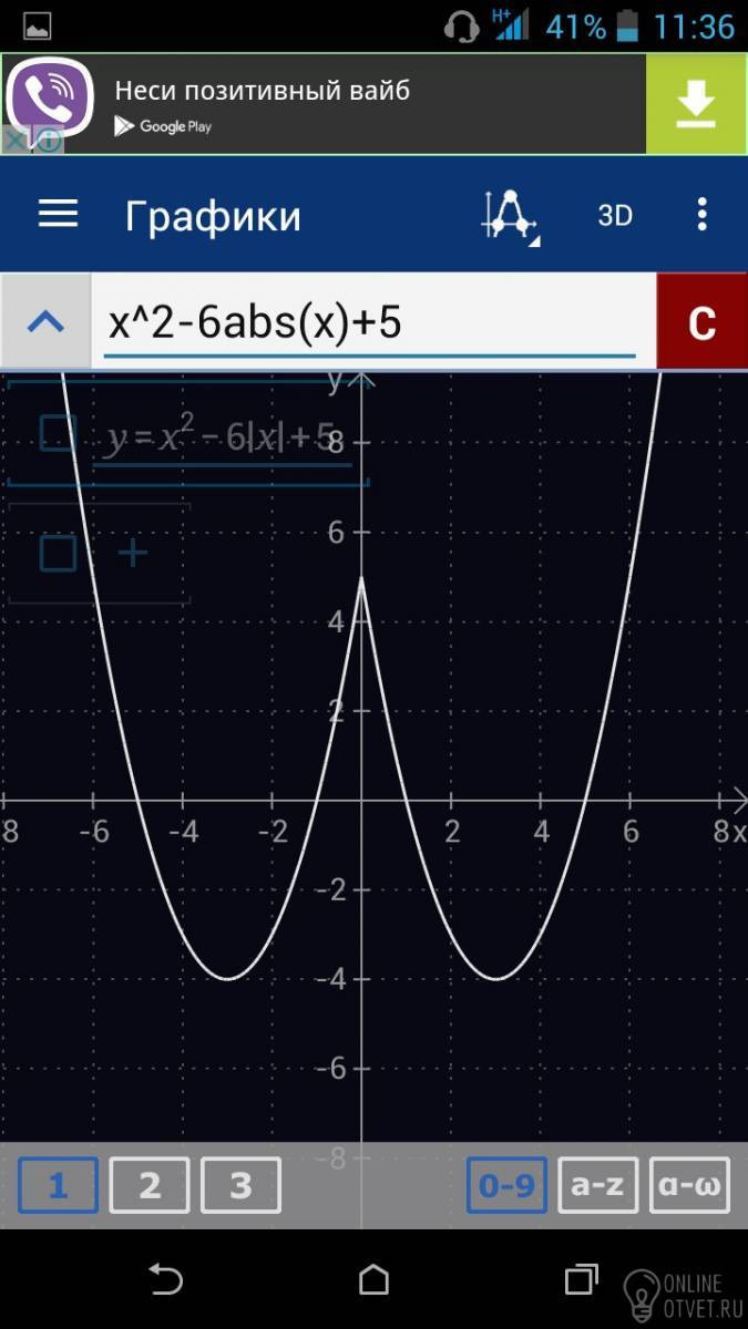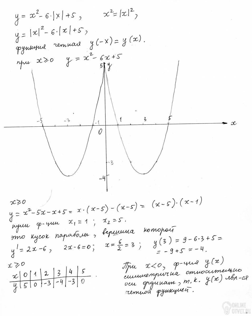Постройке график функции у=х^2-6|х|+5.Какое наиб.число общих точек график данной функции может иметь с прямой ,параллельной оси абсцисс?