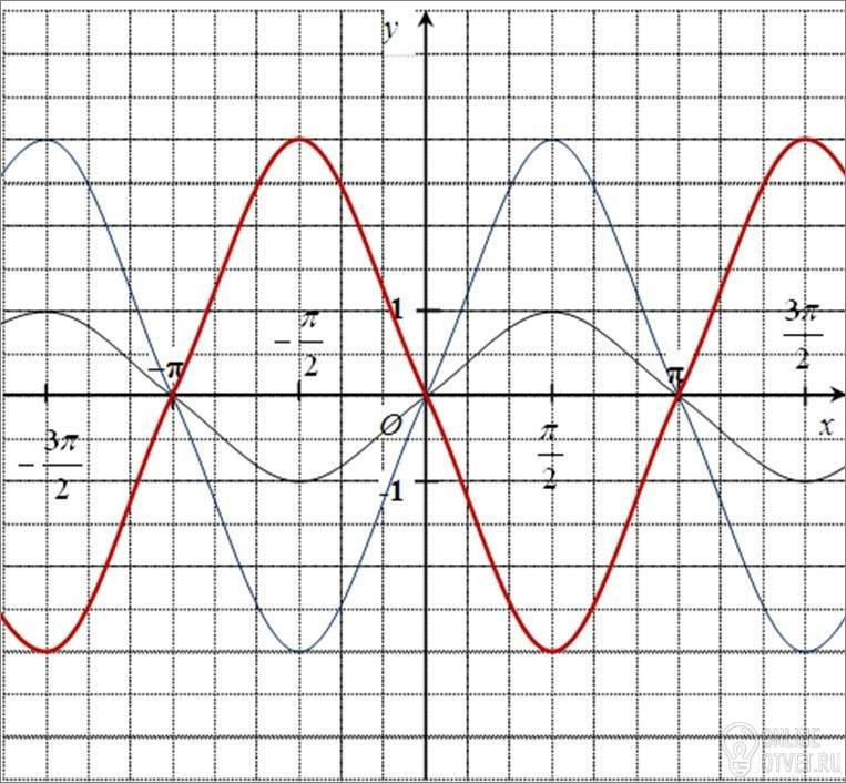 3) затем строим график функции у = -3sinx, отражая его симметрично относительно оси Ох (на рис. - красного цвета).