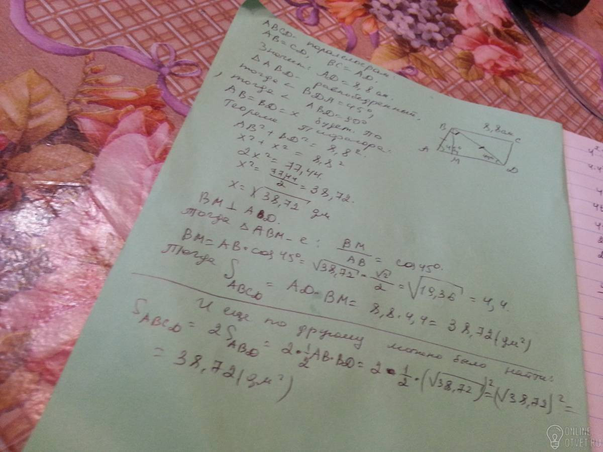 ABCD параллелограмм, AB=BD, BC=8,8 дм, угол BAD=45 градусов. Найдите SABCD