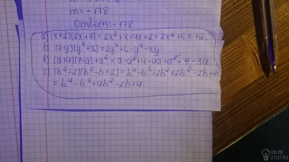 Помогите пожалуйста это кр-ные задания 1упростите выражения а) (х+2) (2х+1) б) (2-у) (у3степеньи +3) в) (а+4) (1-а) +а2степ Г) (b2степ+2) (b2степ-b+2)