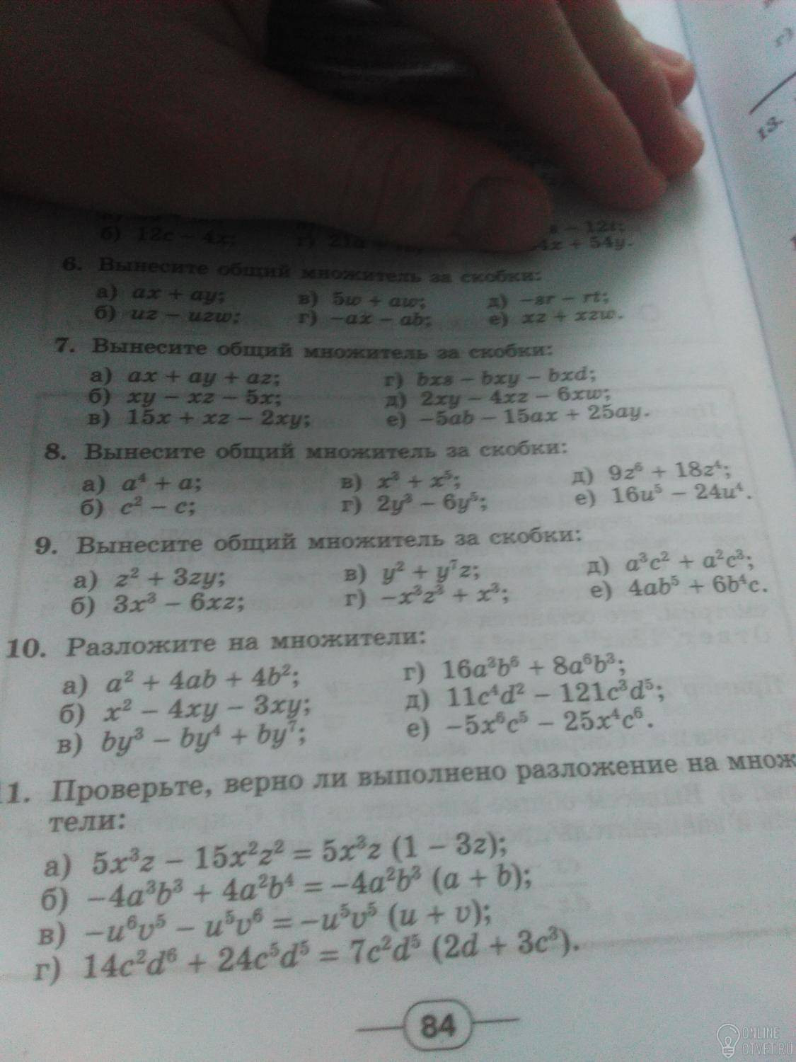 9). а).z^2+3zy=z(z+3y); б). 3x^3-6xz=3x(x^2-2z); в). y^2+y^7z=y^2(1+y^5z); г).-x^3z^3+x^3=-x^3(z^3-1); д). a^3c^2+a^2c^3=a^2c^2(a+c); е). 4ab^5+6b^4c=2b^4(2ab+3c). 10). a).a^2+4ab+4b^2=(a+2b)^2; б).x^2-4xy-3xy=x^2-7xy=x(x-7y); в).by^3-by^4+by^7=by^3(1-y-y^4); г).16a^3b^6+8a^6b^3=8a^3b^3(2b^3+a^3); д). 11c^4d^2-121c^3d^5=11c^3d^2(c-11d^3); е).-5x^6c^5-25x^4c^6=-5x^4c^5(x^2+5c). вроде правильно, но проверьте на всякий случай. может быть где-нибудь напортачил со степенями.