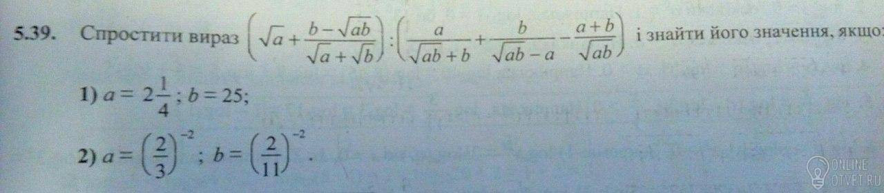 В первой скобочке приводишь к общему знаменателю получается в числителе (a+b), а в знаменателе корень из a +корень из b(корни взаимоуничтожатся после приведения к общему знаменателю) /Dj второй скобочек тоже приводишь к общему знаменателю.Потом первую скобку делишь на вторую.Все просто.В конце подставляешь конкретные числа