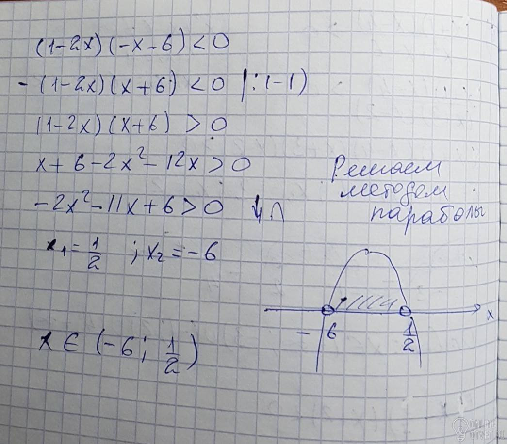 Решить неравенство с помощью рисунка параболы (1-2x)(-x-6) меньше равно 0