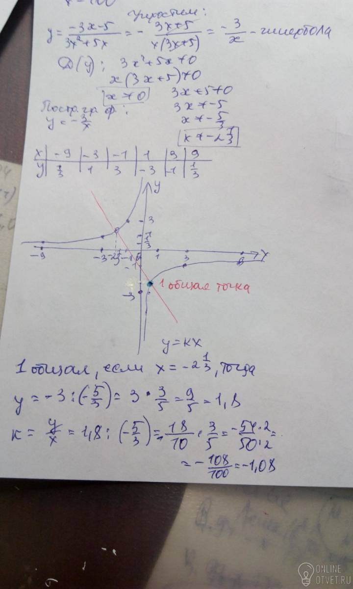 Прошу помощи в этой задаче: "Постройте график функции y=(-3x- 5)/(3x^2+5x) и определите, при каких значениях к прямая y=кx имеет с графиком ровно одну общую точку". Уравнение упростила до уравнения гиперболы, построила её, а вот как точку искать - без понятия.