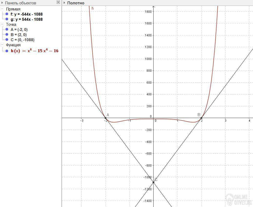 Составьте уравнение касательных к графику функции y= x^8 -15x^4 -16 в точках его пересечения с осью абсцисс. Найдите точку пересечения этих касательных.