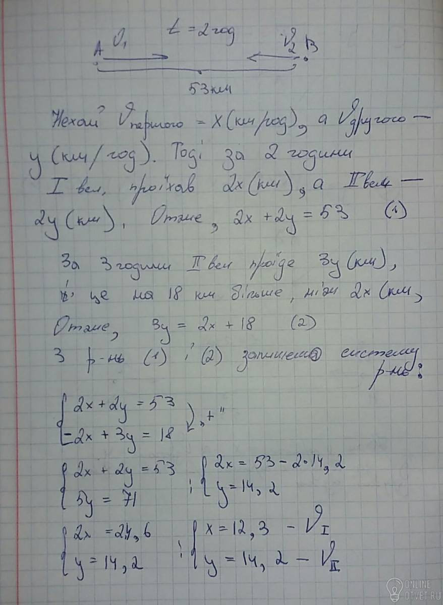 Із двох міст,відстань між якими дорівнює 53 км,одночасно назустріч один одному виїхали двоє велосипедистів,і зустрілися через 2 години .Знайдить швидкість кожного велосипедиста,якщо відомо, що 2 велосипедист долає за 3 години на 18 км бильше,ніж перший за 2 години.
