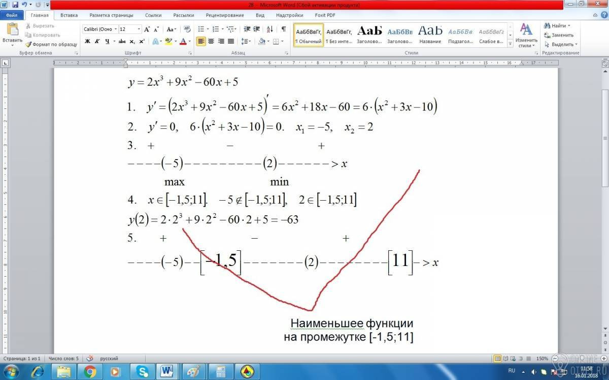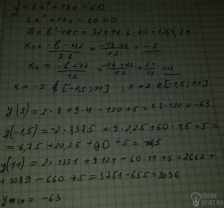 Найдите наименьшее значение функции y=2x^3+9x^2-60x+5 на отрезке [-1,5;11]. Помогите пожалуйста!