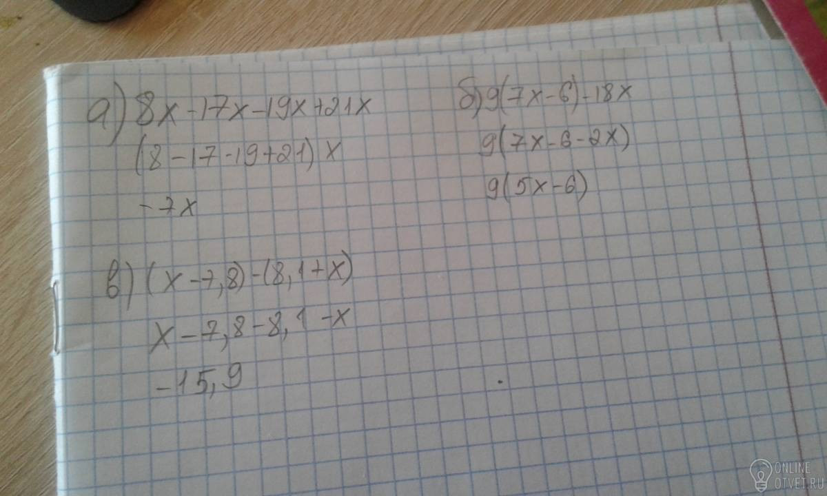 Упростите а) 8x-17x-19x+21X б) 9(7x-6)-18x в) (x+7,8)-(8,1+x)