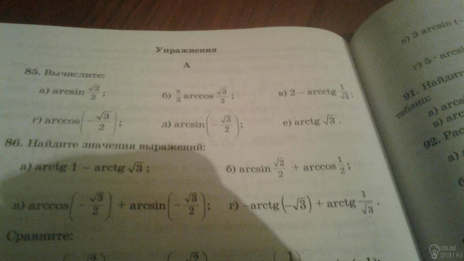 г) arccos(-√3 )/2) =π-arccos(√3)/2)=π-π/6 =5π/6 ;