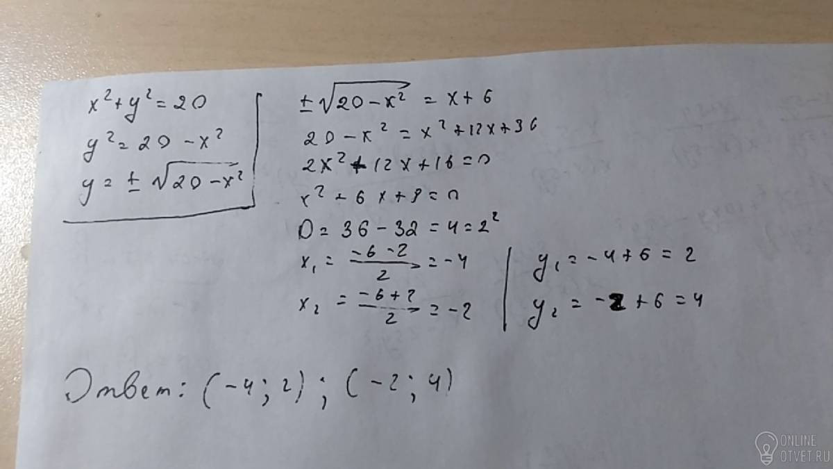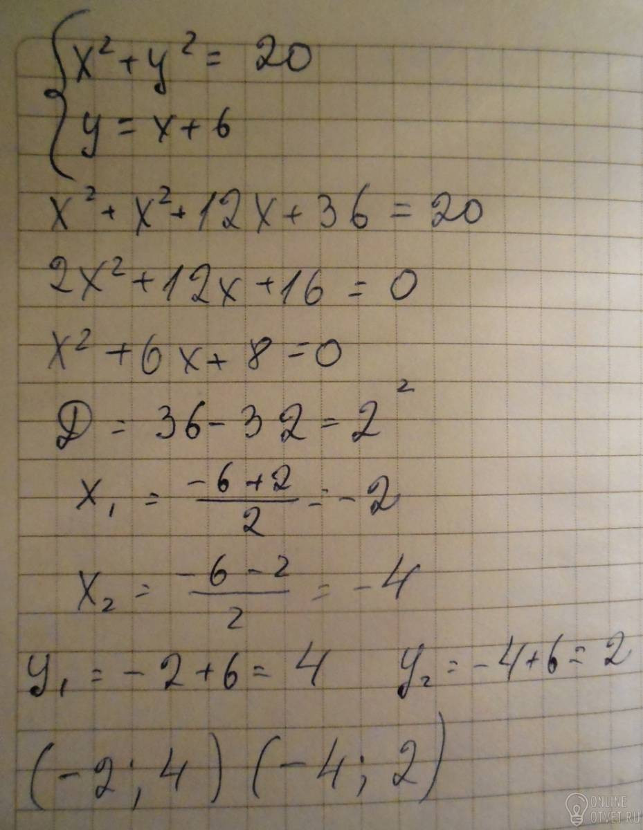 Вычислите координаты точек пересечения окружности х^2+у^2 =20 и прямой у= х+6