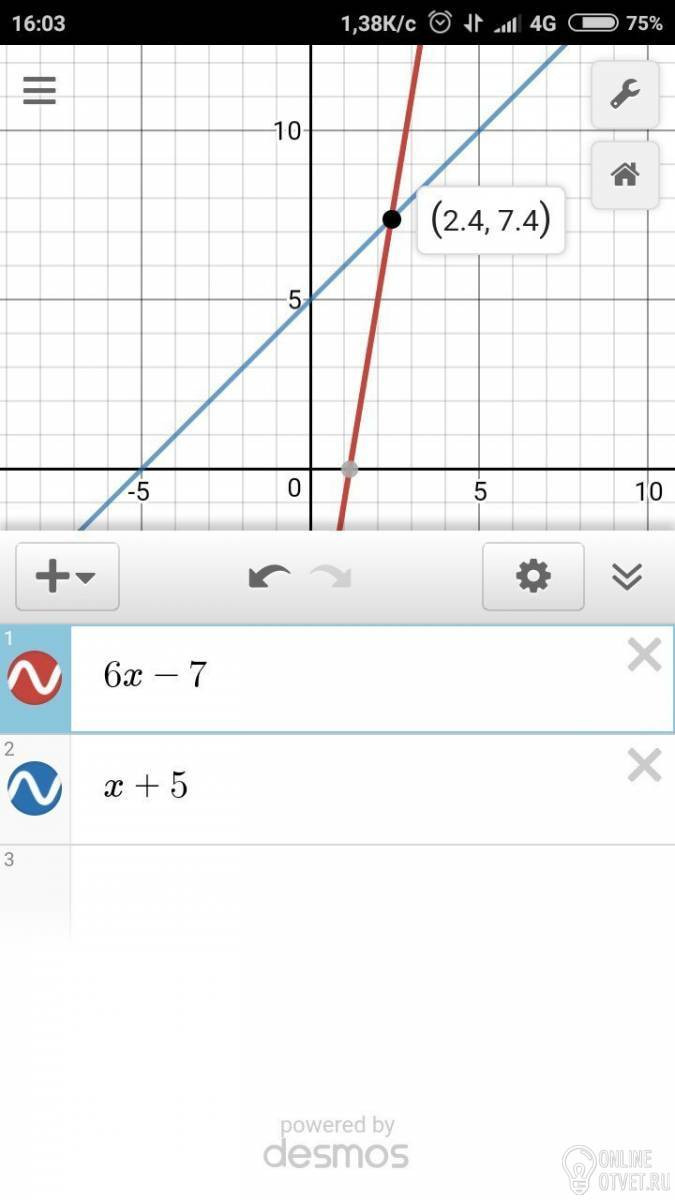 Найди, не выполняя построения, координаты точки пересечения графиков линейных функций: y=x+5 и y=6x−7.