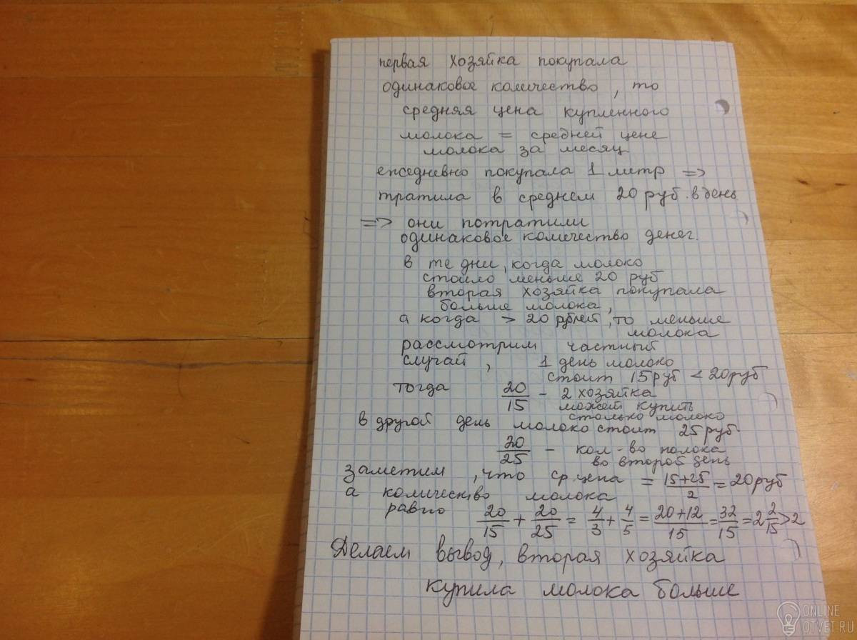 2. Две хозяйки покупали молоко в течение месяца. Цена на молоко ежедневно менялась. Средняя цена молока за месяц оказалась равной 20 рублям. Ежедневно первая хозяйка покупала по одному литру, а вторая – на 20 рублей. Кто из них потратил за этот месяц больше денег и кто купил больше молока?