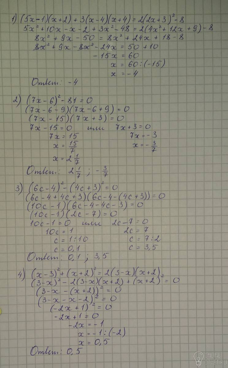 3.Решите уравнение: 1) (5x-1)(x+2)+3(x-4)(x+4)=2(2x+3)²-8; 2) (7x-6)²-81=0; 3) (6c-4)²-(4c+3)²=0; 4) (x-3)²+(x+2)²=2(3-x)(x+2);