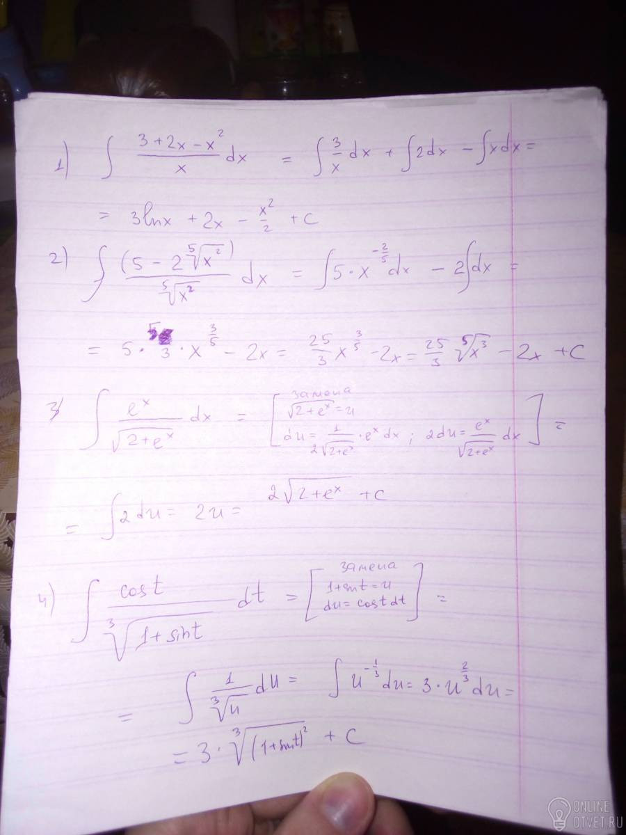 ∫(3+2x-x^2/x)dx , ∫(5-2*корень пятой степень из x^2/корень пятой степени из x^2)*dx, ∫( e^x dx/корень из 2+e^x), ∫cost dt/корень третей степени из 1+sinx