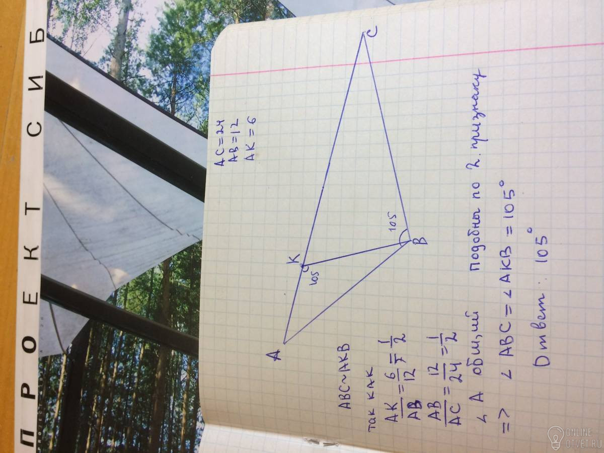 Отрезок ВК соединяет вершину В треугольника АВС с точкой на противолежащей стороне. При этом известно, что < АКВ = 105 градусов, АВ = 12, АС = 24, АК = 6. Найдите < АВС