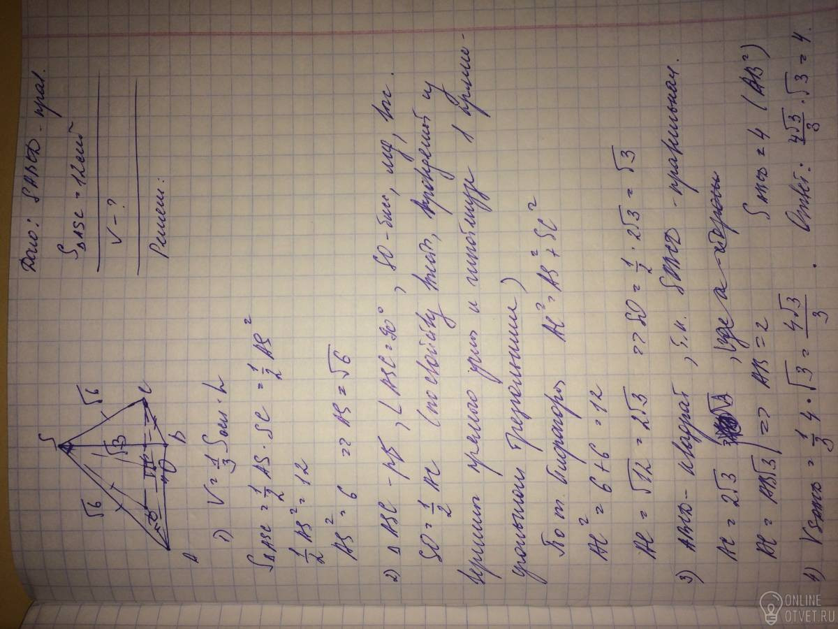 Диагональное сечение правильной четырёхугольной пирамиды является прямоугольный треугольником, площадь которого равна 12 см^2. Найдите объём пирамиды. Ответ умножьте на корень из 3, запишите числом без наименования. Можно, пожалуйста, с решением.