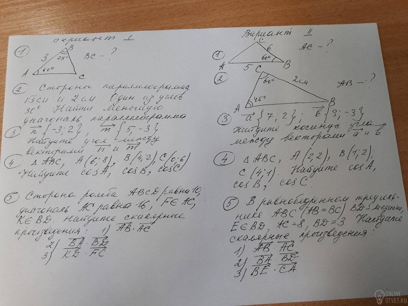 2. Нарисуем этот параллелограмм и обозначим его АВСД.Угол А, равный π/6=180:6=30 градусов.Опустим высоту из тупого угла параллелограмма. Эта высота противолежит углу 30 градусов, и равна поэтому половине√3Высота равна √3/2Расстояние от вершины угла А до основания высоты h найдем по теореме Пифагора. Аh² =3-3/4=9/4Аh=3/2АД=2