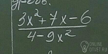 из 3х2 и 9х выносим 3х получается 3х(х+3) и из 2х-6 выносим 2 получается 2(х-3) у нас есть общий множитель (х-3) получается (х-3)(3х-2). Сокращаем и получается в числителе -х+3 в знаменателе 2+3х